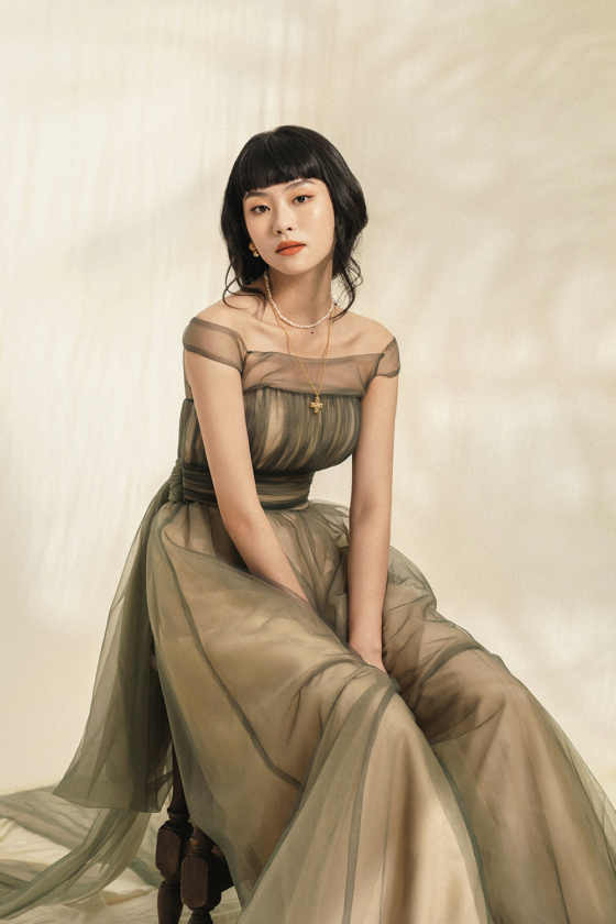 This pastel green dress with a princess silhouette is made of knitted lace fabric and Korean tulle fabric. The lace...