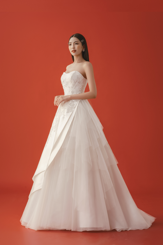 A truly romantic wedding gown crafted from rich beadwork over a base of soft tulle. The full-volume skirt is made...