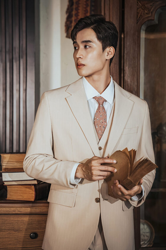 This soft beige three-piece suit embodies refined sophistication and effortless charm. The light tone enhances a clean, modern silhouette, making it perfect for daytime weddings or elegant events.