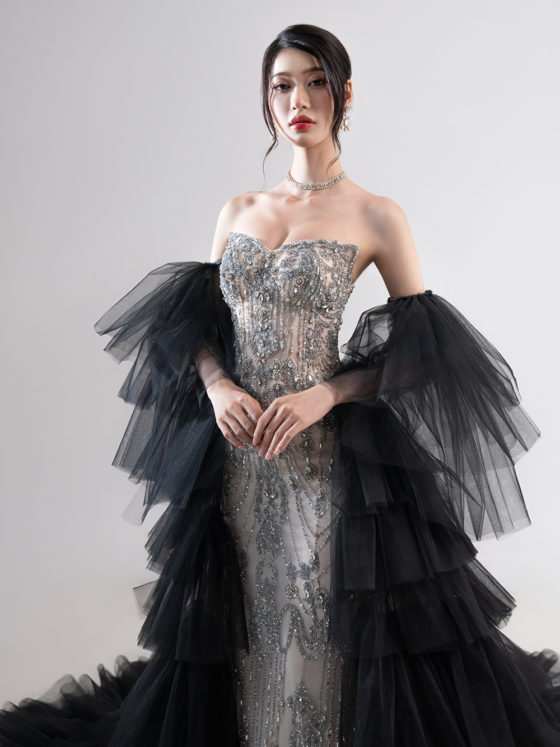 Black velvet for bodice of dress combined with leaf and floral beading makes it become classic and luxury gown