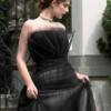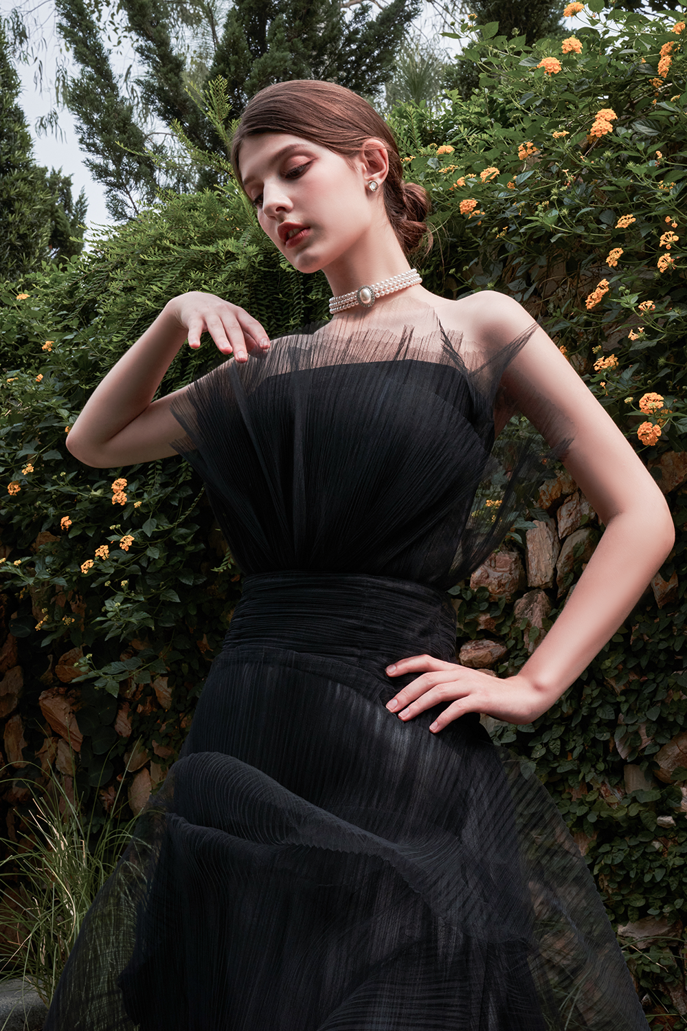The dress is designed luxuriously, with layers of fabric creating a luxurious and splendid look.