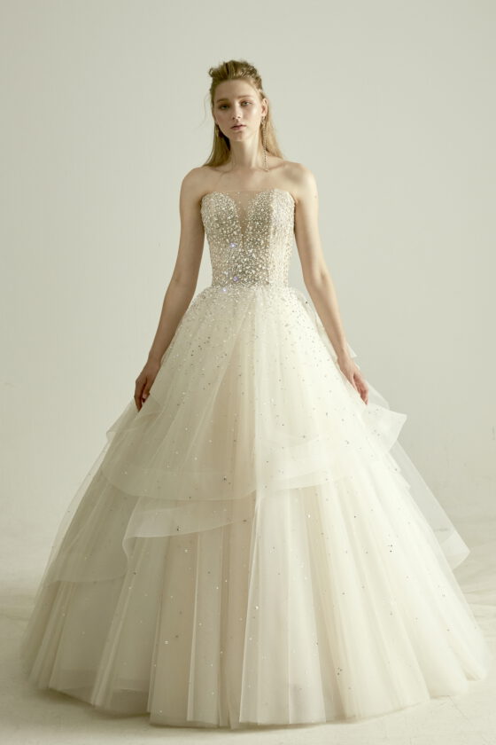 Princess gown with delicate draping and handcrafted beading details embellished this dreamy blue tulle dress.