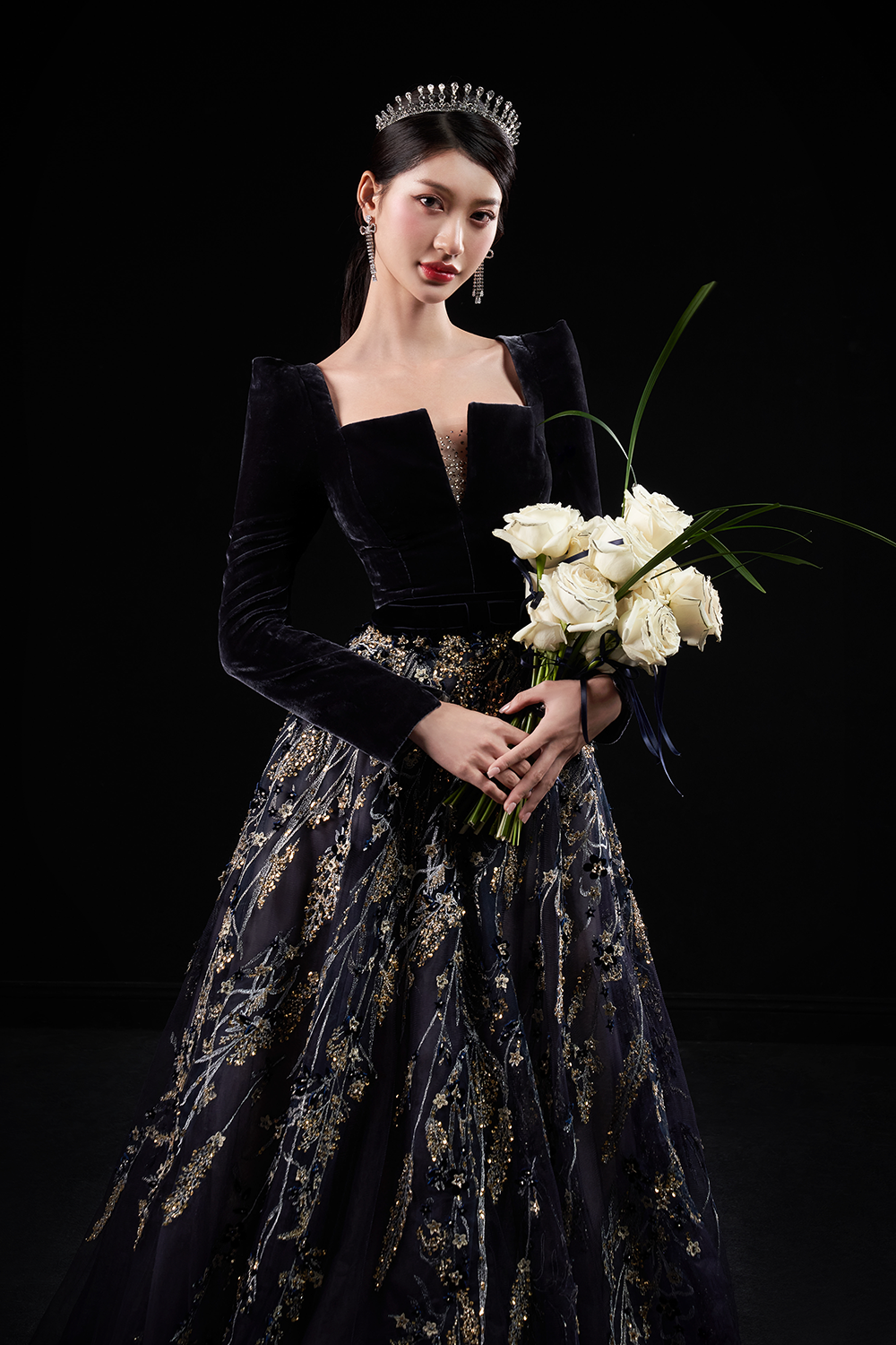 Black velvet for bodice of dress combined with leaf and floral beading makes it become classic and luxury gown