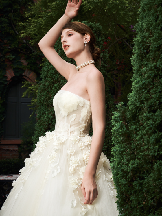 Laser-cut organza leaves are crafted into 3D flowers blooming across dress, adorned with shiny pearls and lace motifs - a...