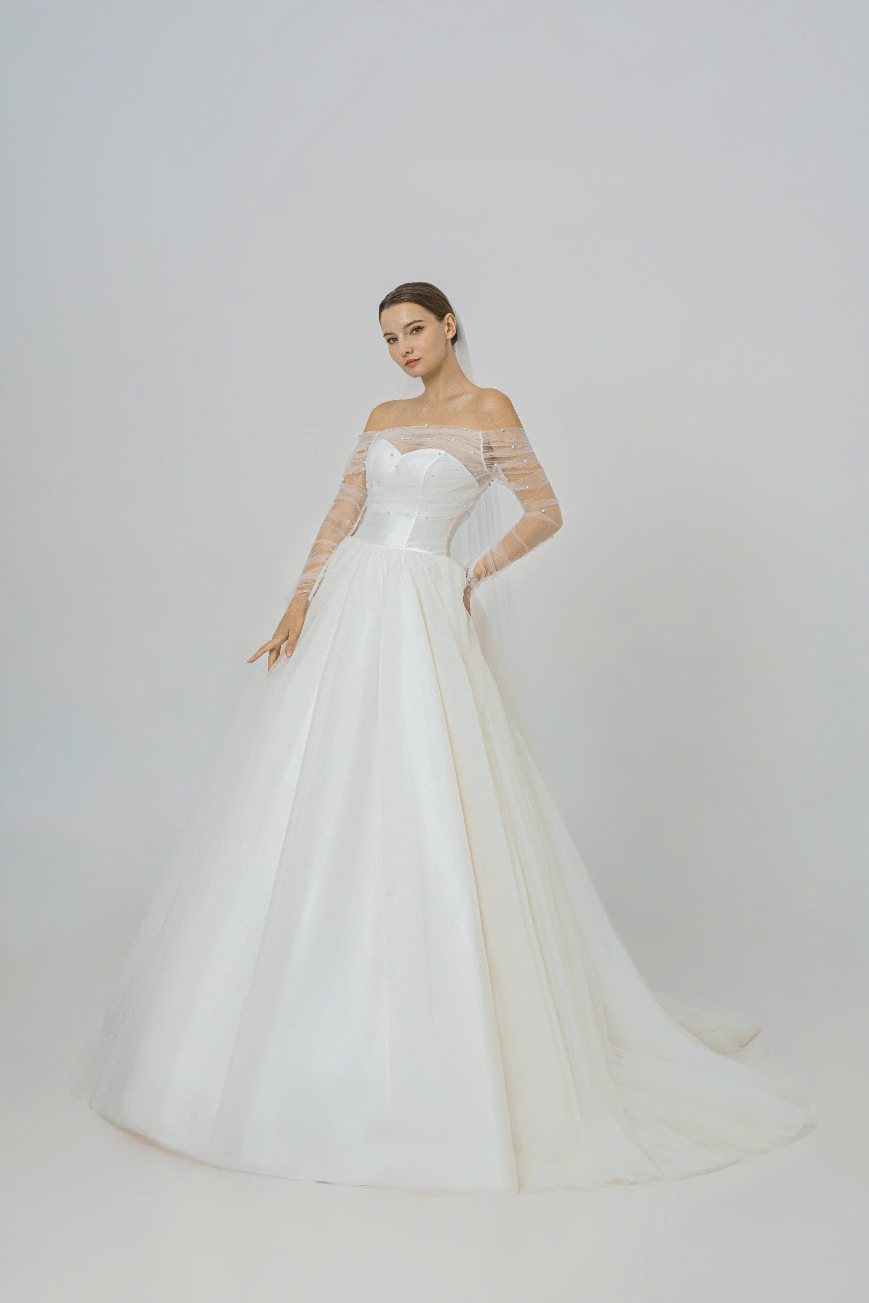 This wedding gown exudes elegance with its voluminous silhouette and luxurious white fabric. The off-shoulder design and sheer ruched sleeves add a romantic touch, while the fitted corset accentuates the waist. A perfect choice for a timeless and sophisticated bride.
