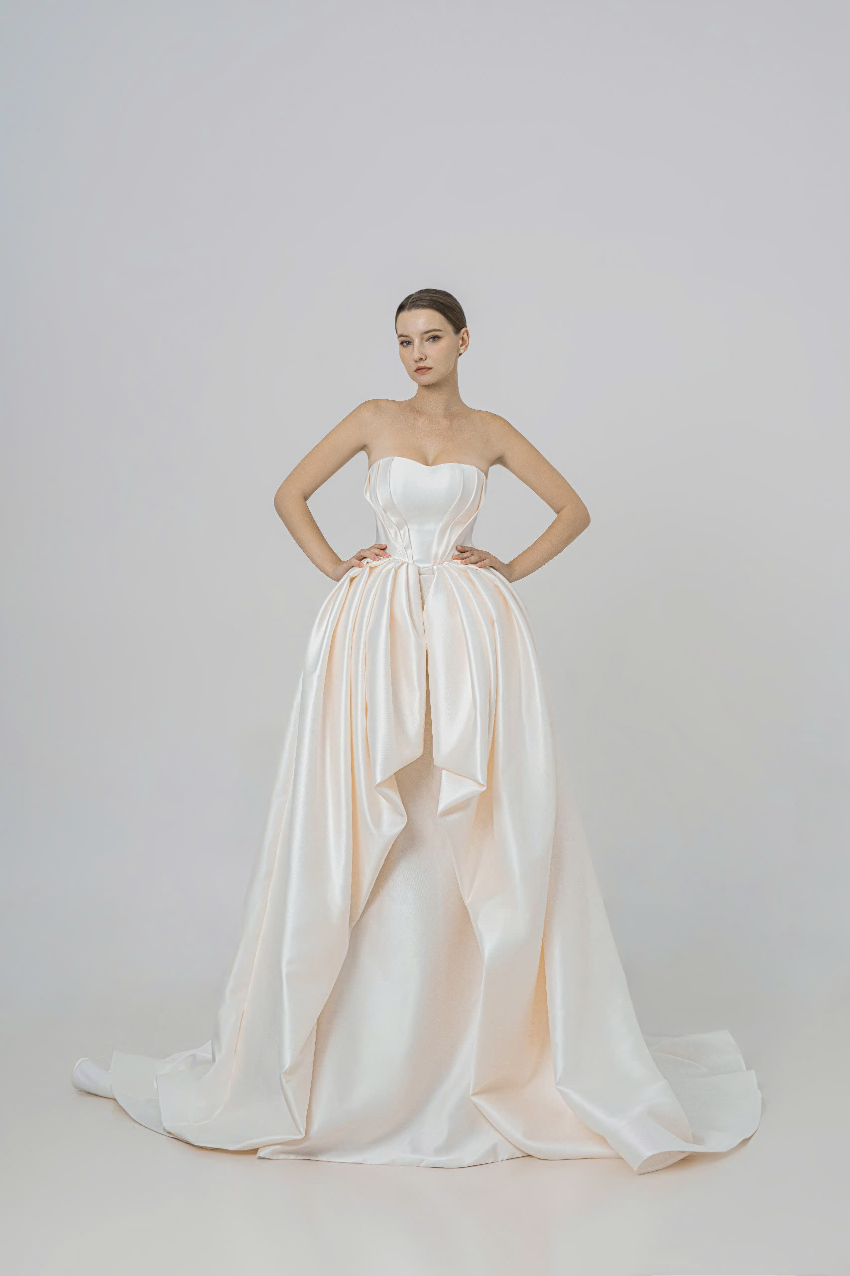 This elegant gown features a structured corset bodice and a voluminous skirt with sculptural draping. The strapless design enhances sophistication, while the luxurious satin fabric adds a timeless and refined touch. A perfect choice for modern elegance.