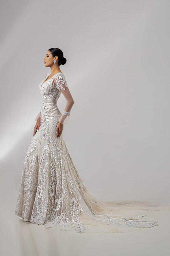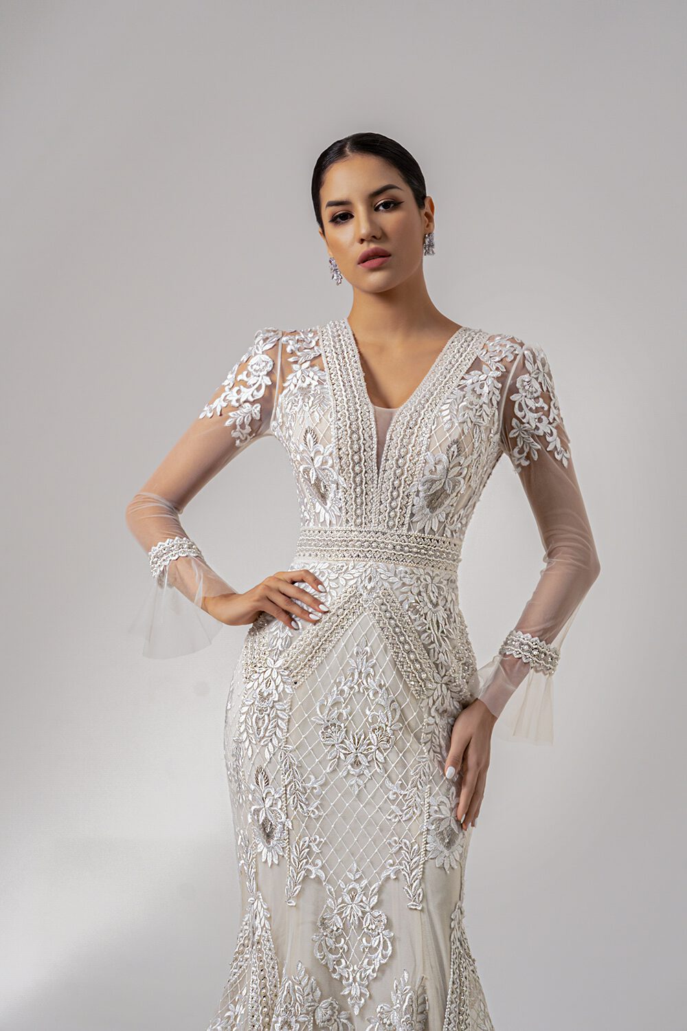 The mermaid dress with embroidered lace material, combined with beaded embellishments following the lace, along with long mesh sleeves with flared cuffs brings sophistication, elegance, and classic style for the bride.