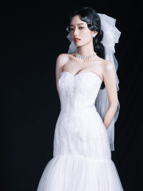 Pink mermaid dress in tulle and beading. As if sweet dream with pink color, body sculpted mermaid tulle dress with...