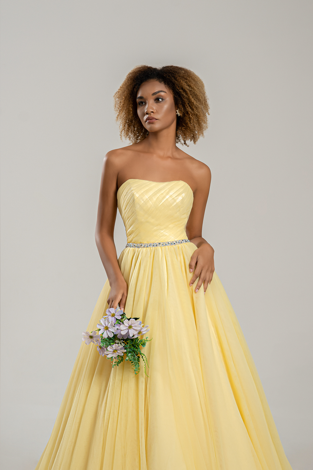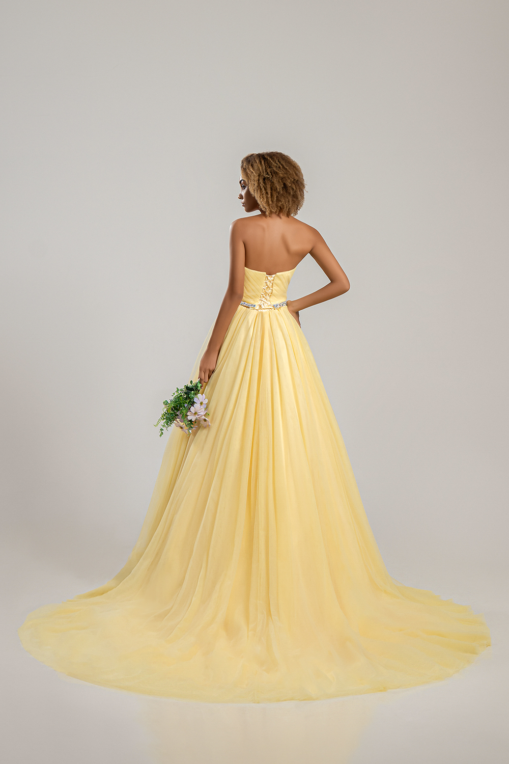 Princess is a line of wedding dresses that many brides love. The upper part fit the body, has a demi-sweetheart. Multi-layer on the background of yellow plain tulle fabric combined with beaded belt at the waist.