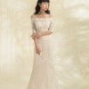 Royal lace pattern covering the body combined with crystals on the figure-flattering mermaid dress with off-the-shoulder long sleeves create a luxurious and feminine effect.