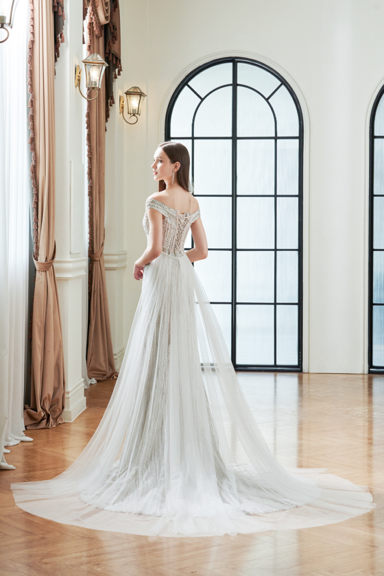 The combination of a puff sleeve design inspired by classic style, and romanticism by long off-shoulder silk taffeta princess line...
