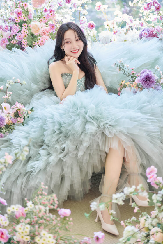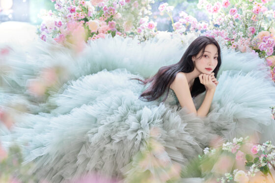 The dress is designed luxuriously, with layers of fabric creating a luxurious and splendid look.
