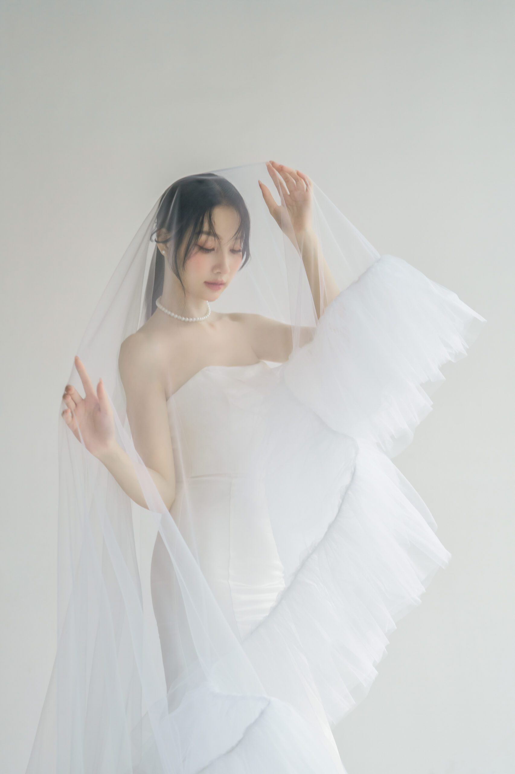 Princess gown with delicate draping and handcrafted beading details embellished this dreamy blue tulle dress.