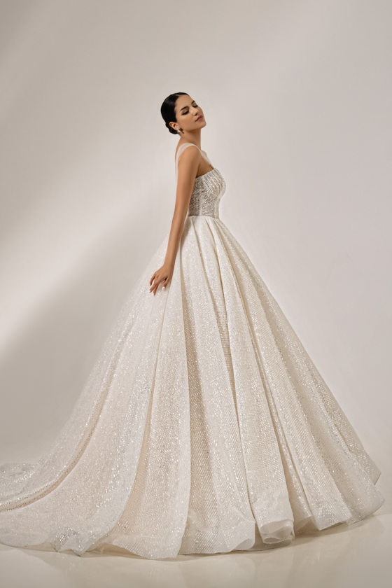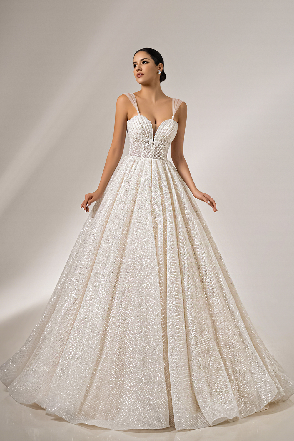 The sequins and beads on the A-line dress with sparkling tulle and heart-shaped neckline effectively flatter the figure, making it easier for the bride to catch-light.