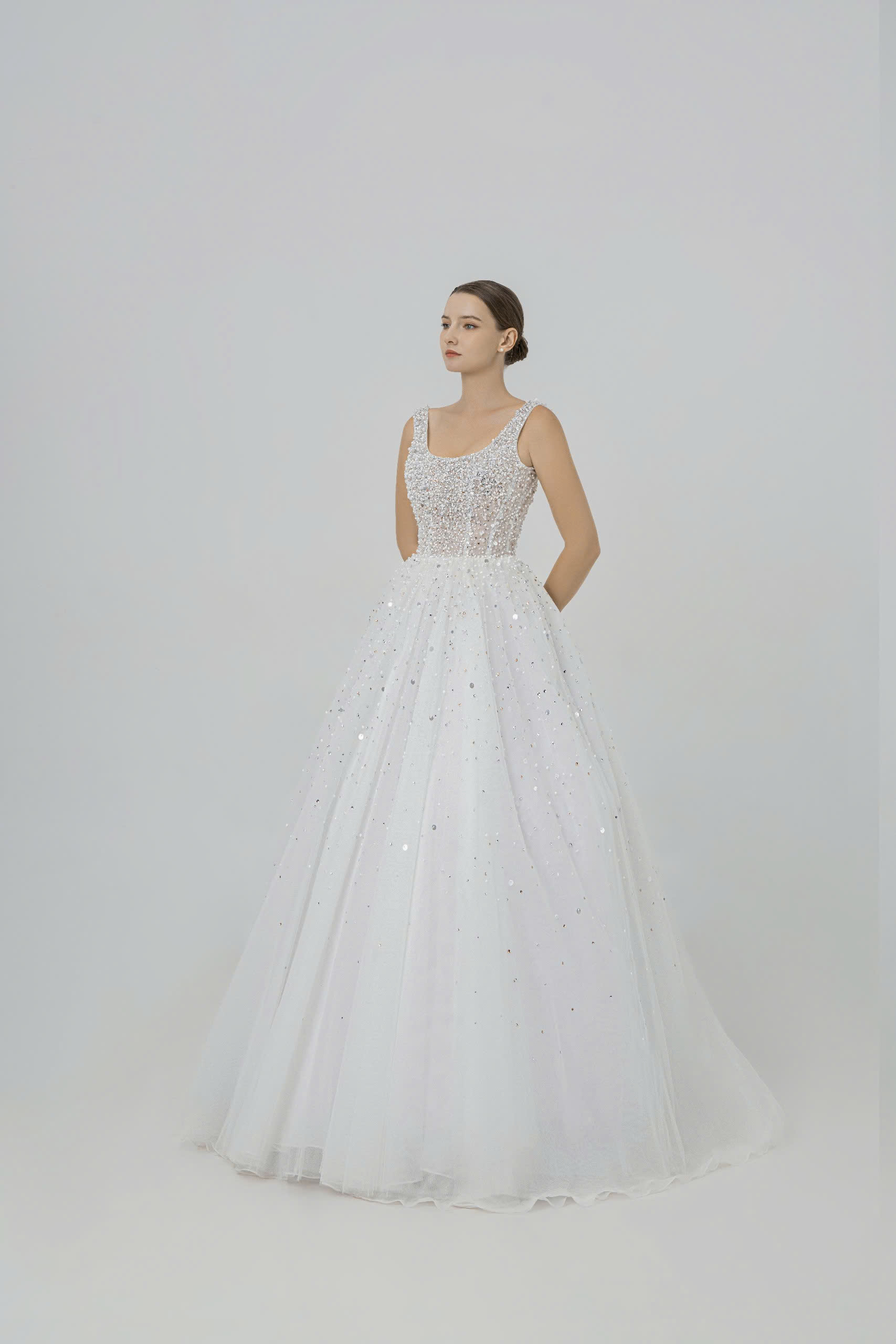 This wedding gown exudes elegance with its voluminous silhouette and luxurious white fabric. The off-shoulder design and sheer ruched sleeves...