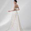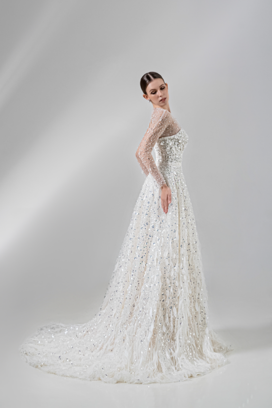 A breathtaking line A-line style dress created in soft beaded tulle. Ivory under-layering add subtle color shading, and the sweetheart bodice features rich hand beadwrok. Ostrich feather render the dress with an exquisite beauty. A detachable yoke lets you create two bodice styles: sweetheart and long sleeves with ‘bolero’ wedidng jacket, making this dress particularly versatile for both ceremony and party.
