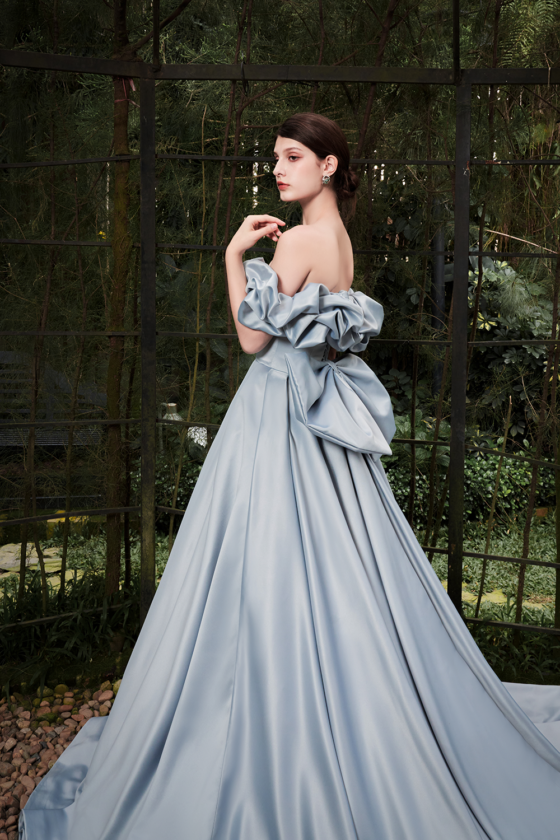 The A-line rose satin gown is an exquisite display of hand-ruffle draping. Big and long bow on back increase exclusion, ethereal more effective.